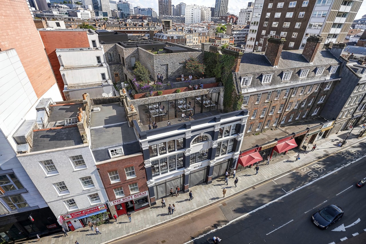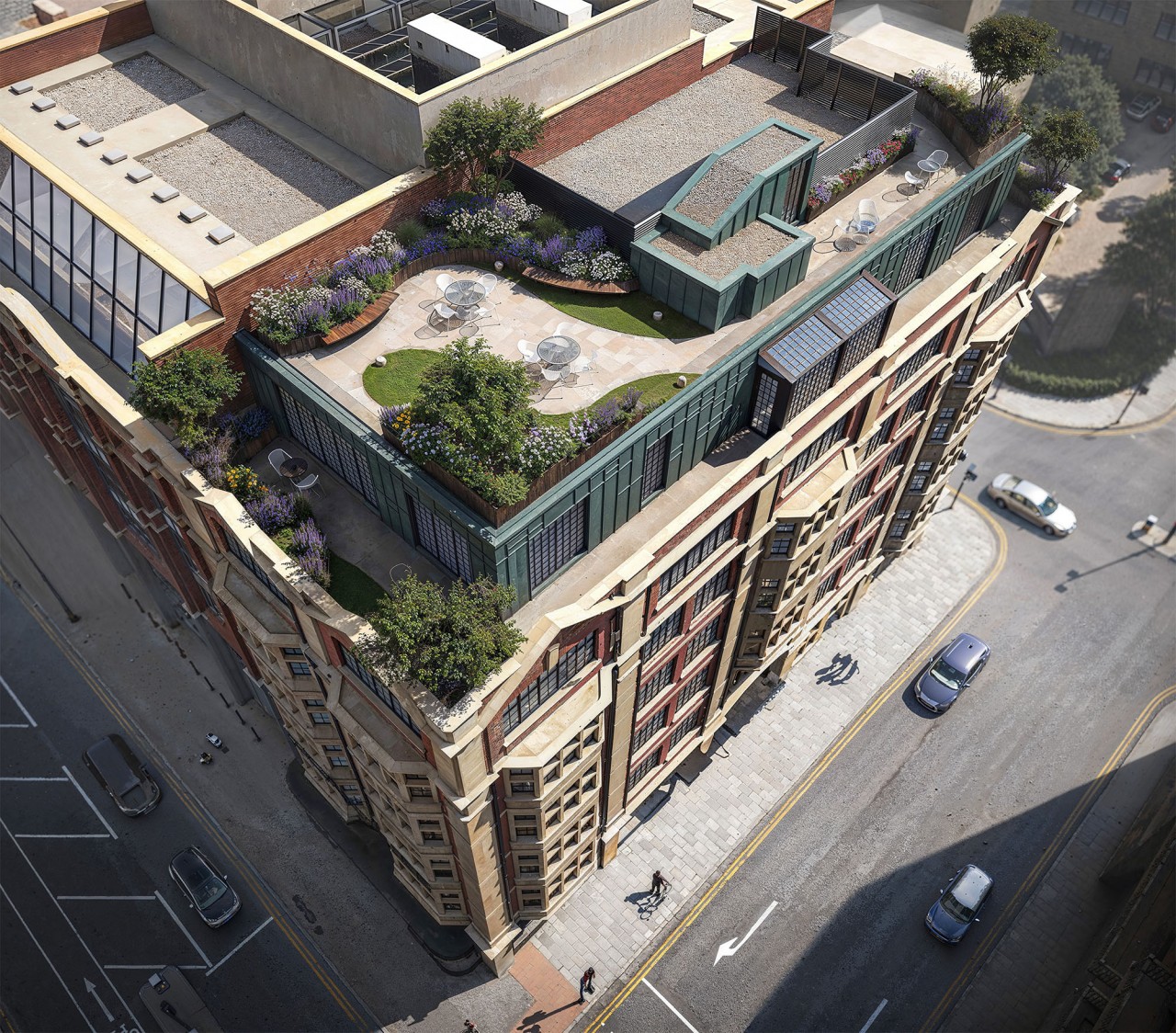 Tailors Corner was home to a well-known tailoring store called Hepworths and today is one of the most iconic landmarks of the city. The elevated CGI focuses on the design of the new roof garden, which highlights its strong and immersive planting scheme and represents a significant moment of biodiversity within the urban centre.