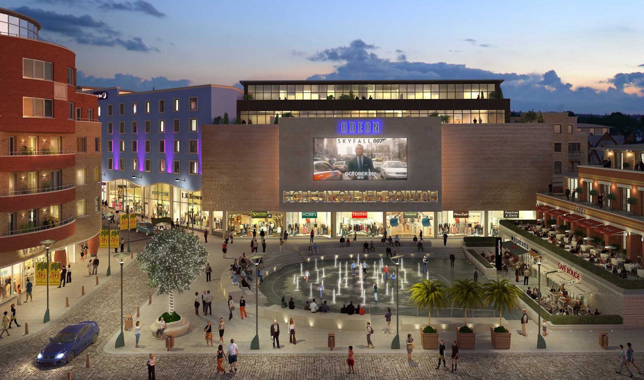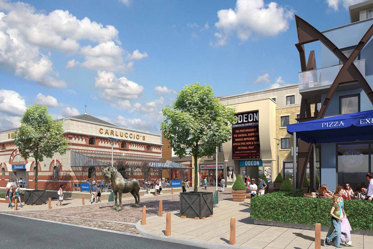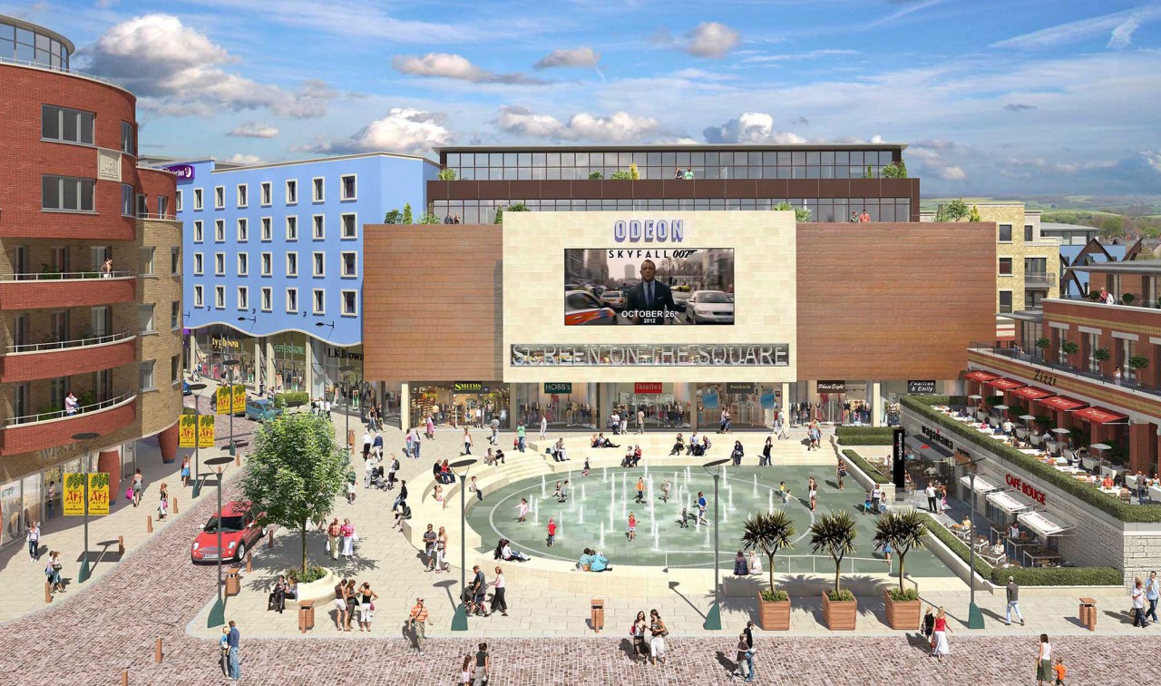 The main square of the development, which is housed within the site of the old Eldridge Pope brewery, features a 37-jet fountain and a big screen television used to show short films and major sporting events.