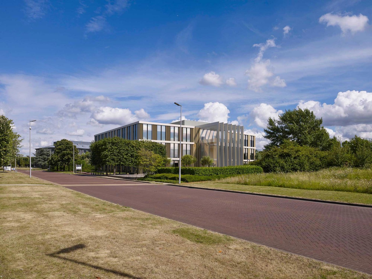 The images efficiently convey the consistent cladding treatment across all office floors, the double-height reception located between the two office wings and the integration of the decked car park structure into the landscape.